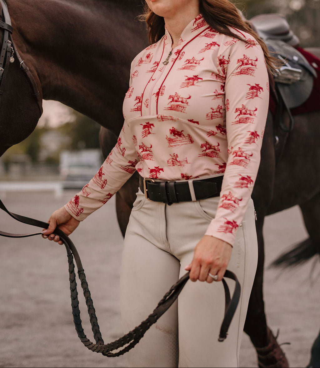 Designed with the modern equestrian in mind, our Sunshirts are made to make your ride more comfortable—no matter the season. Each piece is crafted from premium 4-way stretch fabric that moves with you, accommodating natural body fluctuations while maintaining a flattering silhouette. Moisture-wicking and breathable, they keep you cool and confident . But most importantly, every detail is thoughtfully designed to make you look and feel beautiful—because performance and elegance should always ride together.