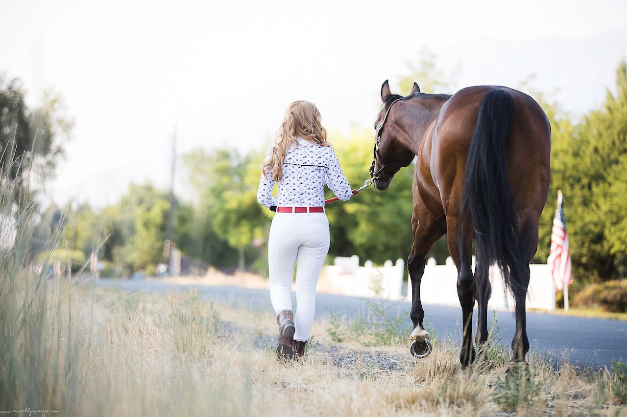 With a mandarin collar and beautiful piping accents, you are sure to be the most stylish rider in the arena. Long-sleeved with a breathable underarm panel, contrast piping in all the right places, and a beautiful stiff collar to protect you from the sun.