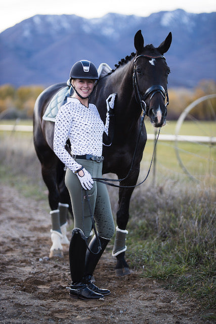 All EA Filigree Sunshirts are moisture-wicking and comfortable. With a four-way stretch and sport fit, don't expect this chic top to constrict any sitting trots or 2 points. The EA Ditsy is designed to transition seamlessly from one activity to the next, whether it be riding, yoga, golf, or traveling.