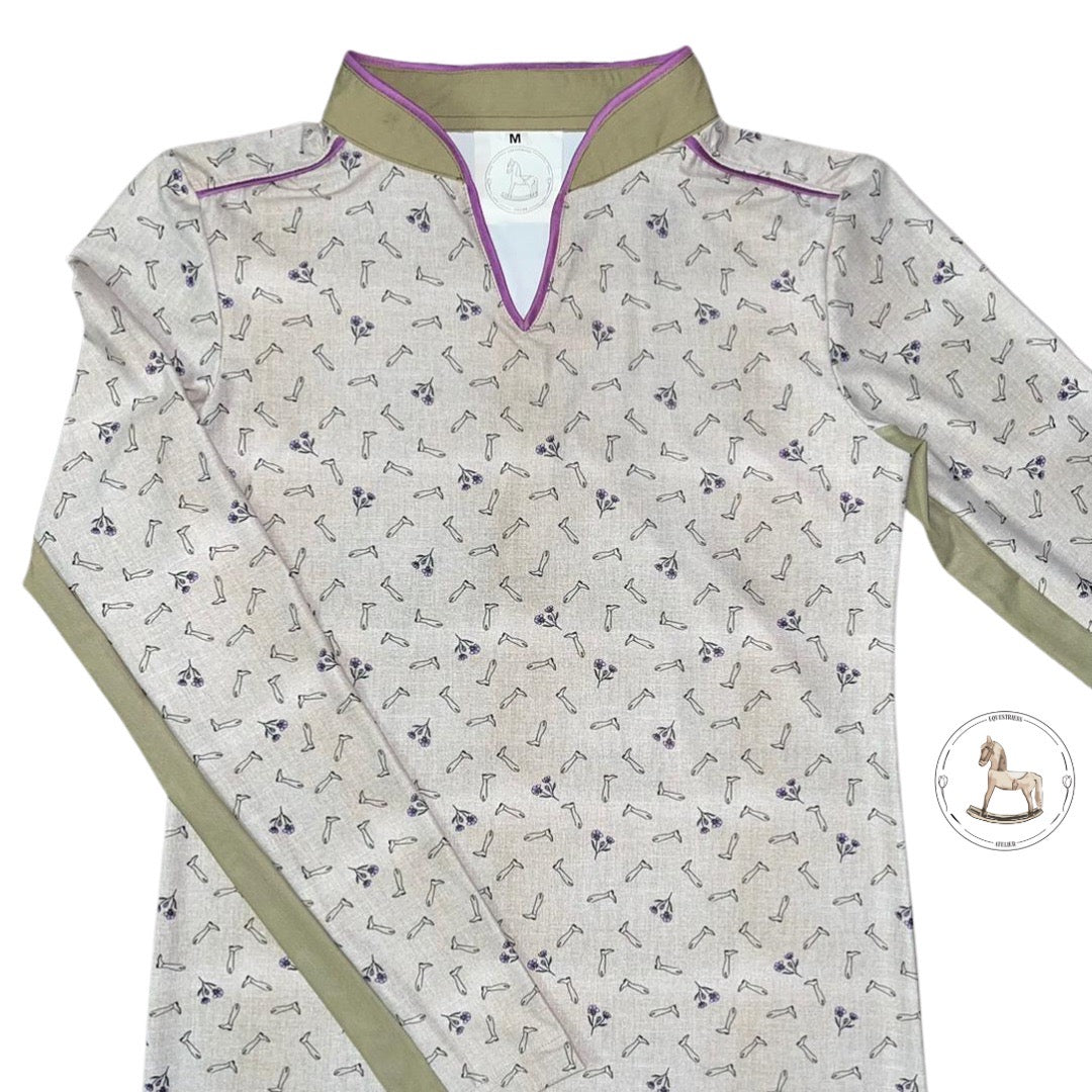 With a mandarin collar and beautiful piping accents, you are sure to be the most stylish rider in the arena. Long-sleeved with a breathable underarm panel, contrast piping in all the right places, and a beautiful stiff collar to protect you from the sun.