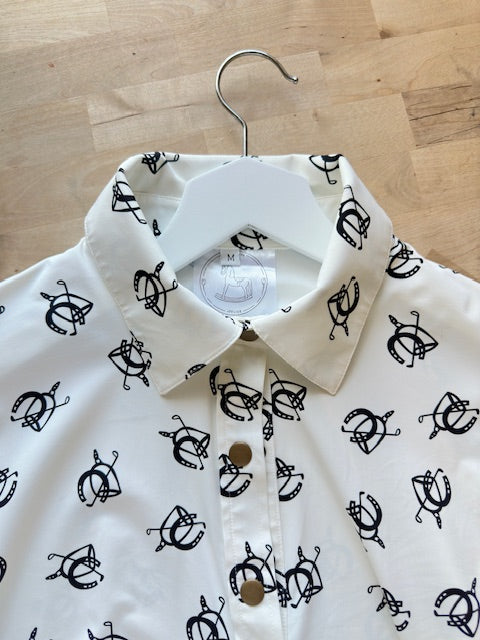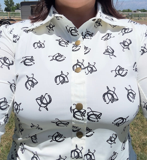 Our Vaquera Sunshirt features a classic button-down design with our personal twist: a pullover style with three beautiful brass-colored snap buttons at the top to prevent gaping. This sunshirt is a true staple for both streetwear and everyday riding, helping you look well put together and classic at any time!