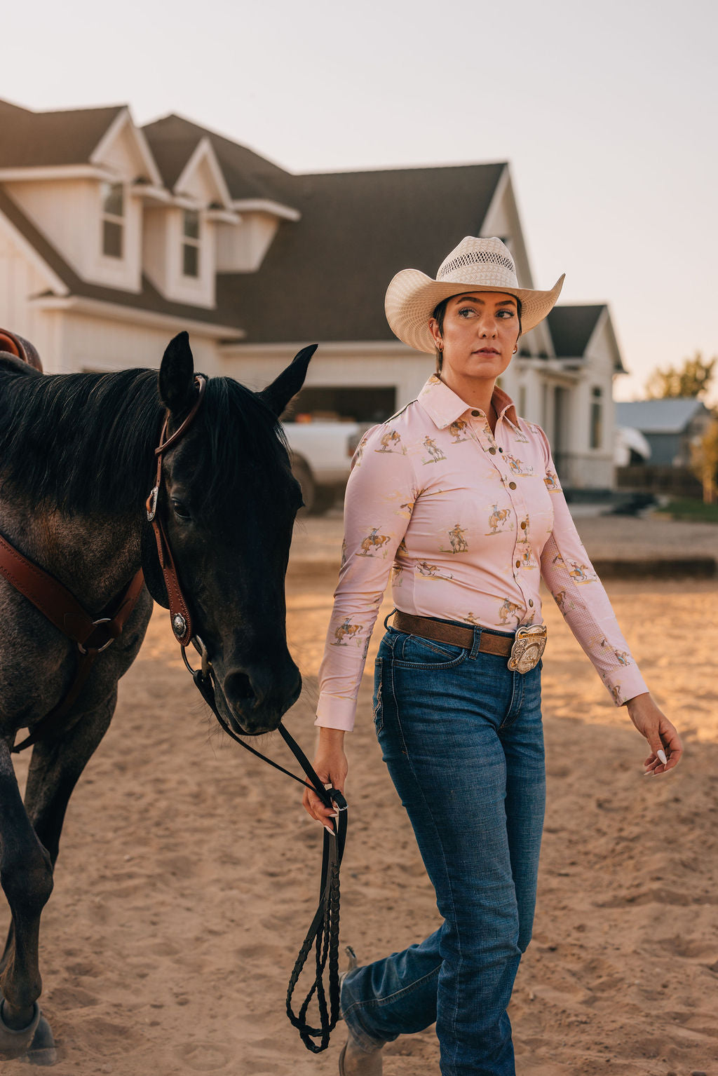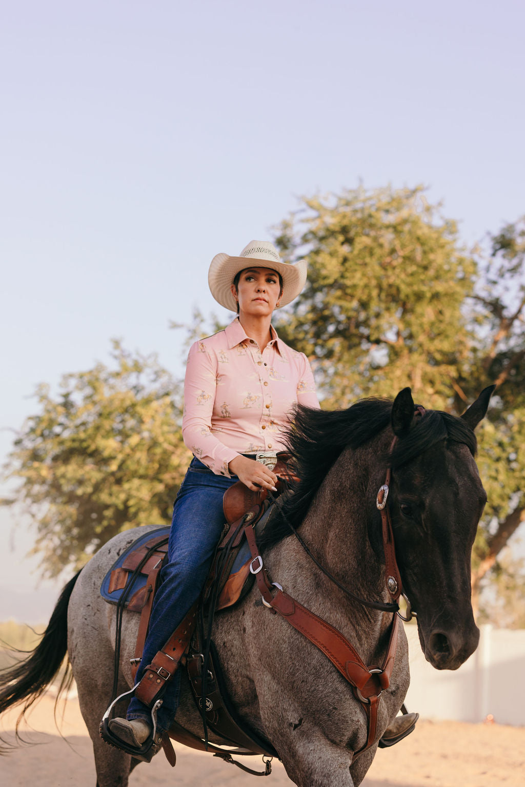 Our Vaquera Sunshirt features a classic button-down design with our personal twist: a pullover style with three beautiful brass-colored snap buttons at the top to prevent gaping. This sunshirt is a true staple for both streetwear and everyday riding, helping you look well put together and classic at any time!