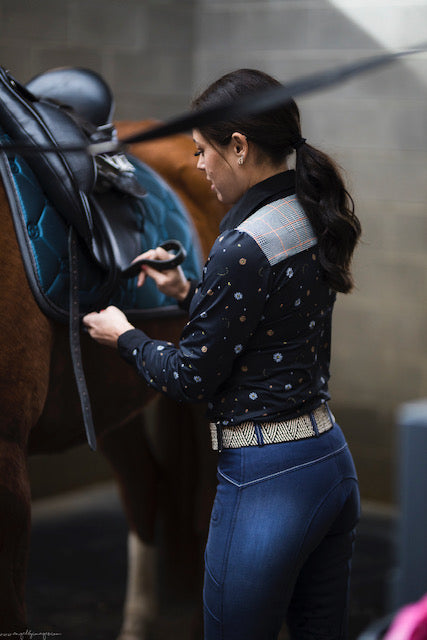 Our Vaquera Sunshirt features a classic button-down design with our personal twist: a pullover style with three beautiful brass-colored snap buttons at the top to prevent gaping. This sunshirt is a true staple for both streetwear and everyday riding, helping you look well put together and classic at any time!